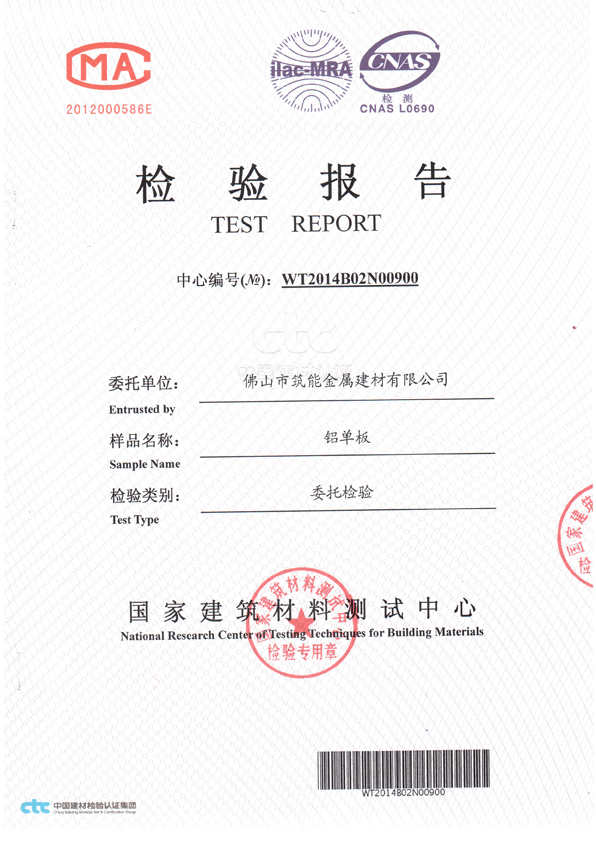 【筑能简讯】热烈祝贺“筑能”铝单板通过国家检验合格