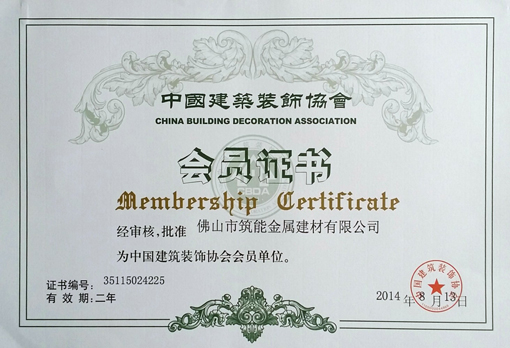 2014年8月13日佛山市筑能金属建材有限公司正式受邀成为“中国建筑装饰协会”会员单位。