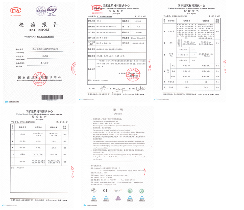 2014年9月11日佛山市筑能金属建材有限公司生产的“筑能”品牌铝单板产品经国家建筑材料测试中心检验合格并取得国家检验报告。