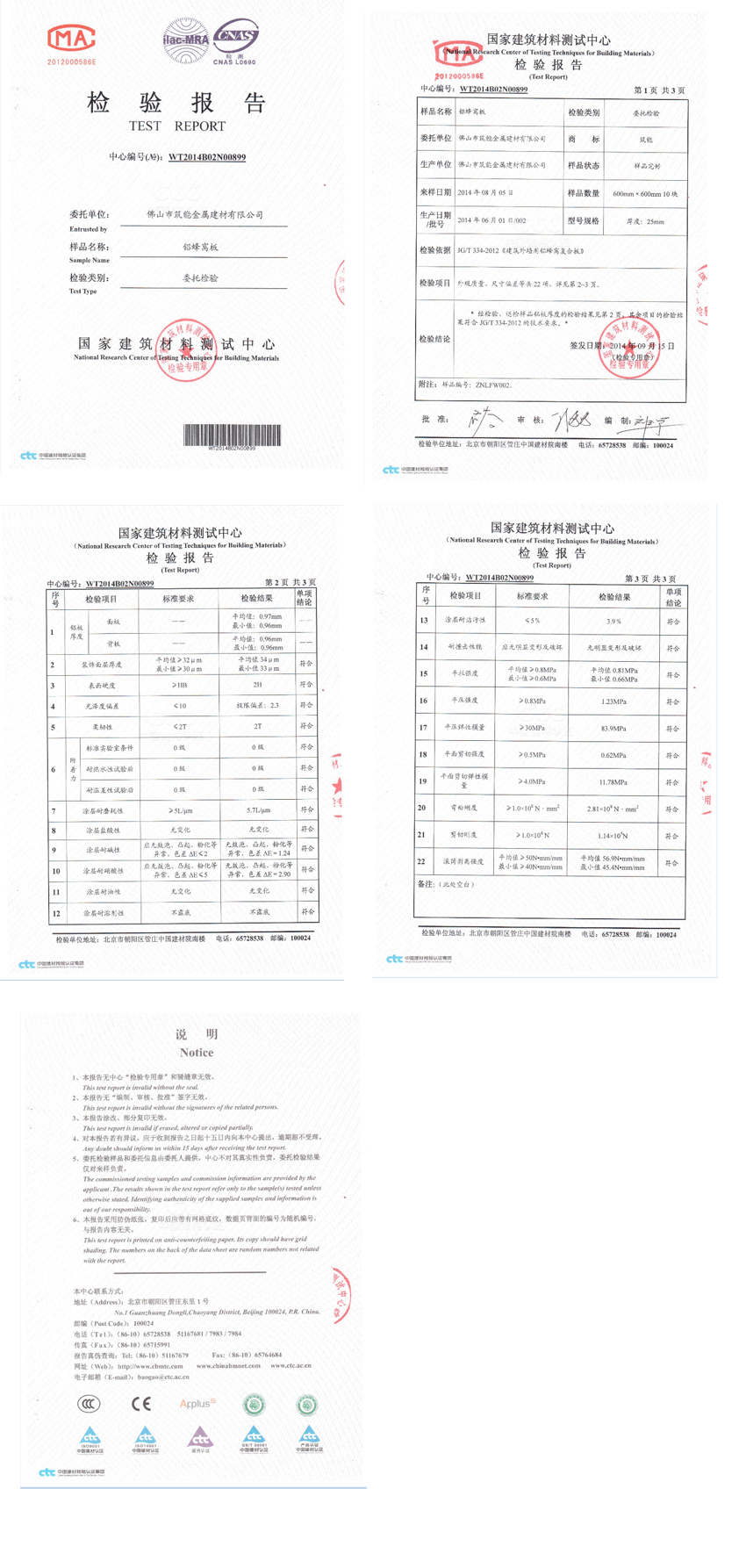 2014年9月15日佛山市筑能金属建材有限公司生产的“筑能”品牌铝蜂窝板产品经国家建筑材料测试中心检验合格并取得国家检验报告。