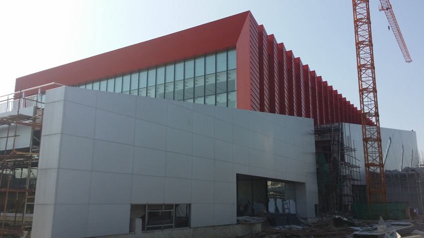 宁德师范学院体育馆幕墙装饰工程由方圆建设集团上海分公司承建,该外墙项目铝单板造形复杂,所采用的铝单板板块面积较大、且焊接数量繁多,在工艺上要求严格,背面采用100mm宽非标的加强筋,且转角部位者必须加装L形加强筋。通过多家铝单板生产企业的角逐,最终成功采用我公司生产的“筑能”品牌铝单板产品。