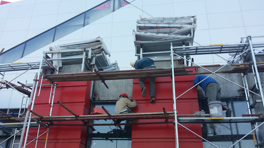 图为工人正在安装筑能铝单板