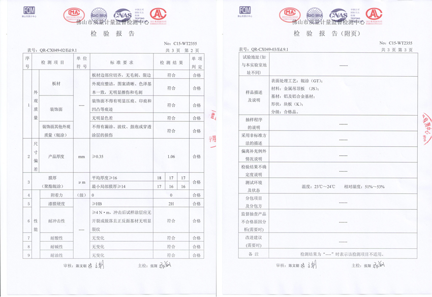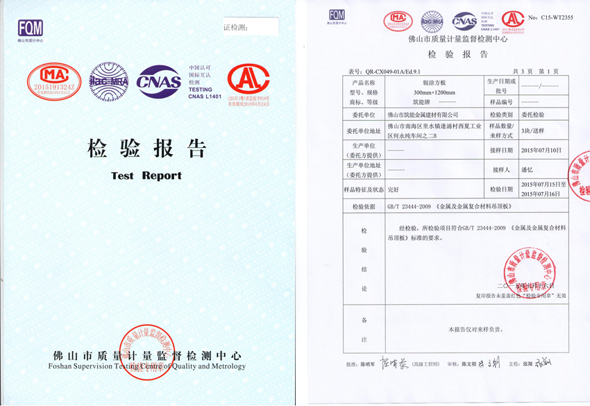 2015年7月16日佛山市筑能金属建材有限公司生产的“筑能”品牌预辊涂铝天花产品经佛山市质量计量监督检测中心检验合格并取得国家检验报告。