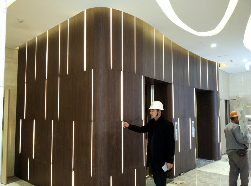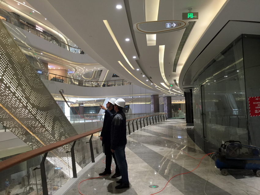 图为福建筑能建筑科技发展有限公司总经理苏一鹏亲临福州东二环泰禾广场三期MALL购物城市广场视察铝蜂窝板安装情况