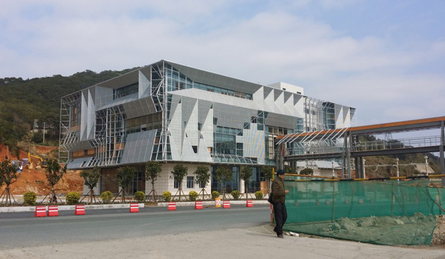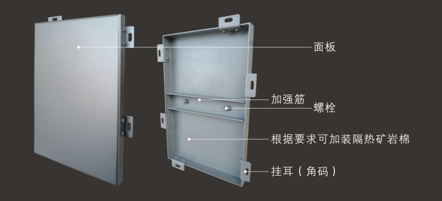 铝单板幕墙采用优质高强度铝合金板材,其常用厚度为2.0mm,2.5mm,3.0mm,型号为3003,状态为H24。常规材料尺寸为≤1300mmx4000mm。其构造主要由面板、加强筋和角码组成。角码可直接由面板折弯、冲压成型,也可在面板的折边上铆装角码成型。加强筋与板面用电焊螺钉连接,使之成为一个牢固的整体,极大增强了铝单板幕墙的强度与刚性,保证了长期使用中的平整度及抗震能力。如果需要隔音保温,可在铝板内侧安装高效的隔音保温材料。