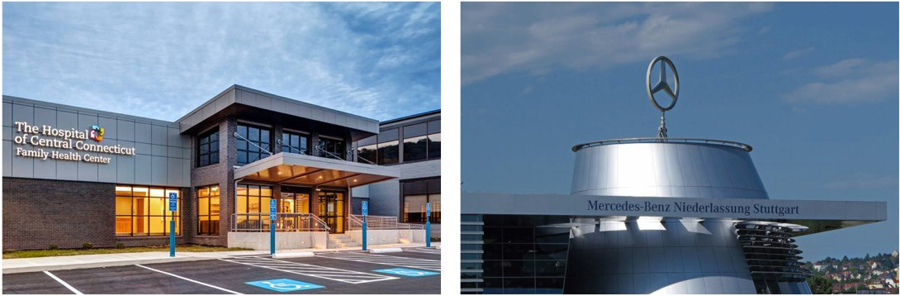 铝单板幕墙采用优质高强度铝合金板材,其常用厚度为2.0mm,2.5mm,3.0mm,型号为3003,状态为H24。常规材料尺寸为≤1300mmx4000mm。其构造主要由面板、加强筋和角码组成。角码可直接由面板折弯、冲压成型,也可在面板的折边上铆装角码成型。加强筋与板面用电焊螺钉连接,使之成为一个牢固的整体,极大增强了铝单板幕墙的强度与刚性,保证了长期使用中的平整度及抗震能力。如果需要隔音保温,可在铝板内侧安装高效的隔音保温材料。