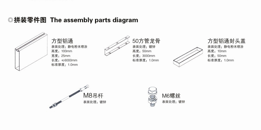 U type RHS smallpox, highly directional, open and transparent, three-dimensional sense of strong, angular lines clear, novel and unique. Adjustable decoration space vision height, collocation of different color, different height of suspension, the introduction of different lighting effects, benefits, and shine, show the elegant, fashionable, good decorative style. To wind code installation structure, used for outdoor decoration can effectively wind effect is more distinct. The installation method of transparent, easy assembly and disassembly.